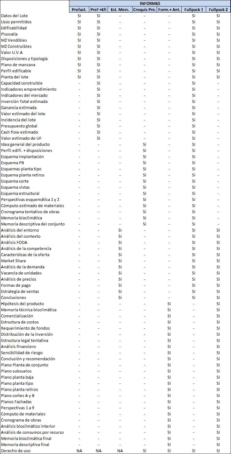 El informe Full Pack 1, esta formado por los informes de Prefactibilidad +EFi, Estudio de Mercado y Croquis Preliminar. Mientras que el pack 2 esta formado por Estudio de Mercado, Formulación del emprendimiento y un Anteproyecto avanzado. Los packs le darán la posibilidad de obtener mas informes a un menor costo y tiempo.